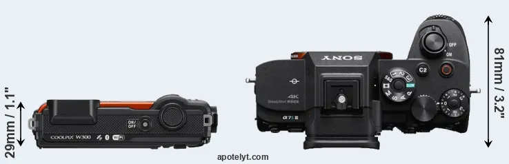 An illustration of the physical size and weight of the Nikon W300 and the Sony A7S III is provided in the side-by-side display below. The two cameras are presented according to their relative size. Three consecutive perspectives from the front, the top, and the back are available. All size dimensions are rounded to the nearest millimeter.