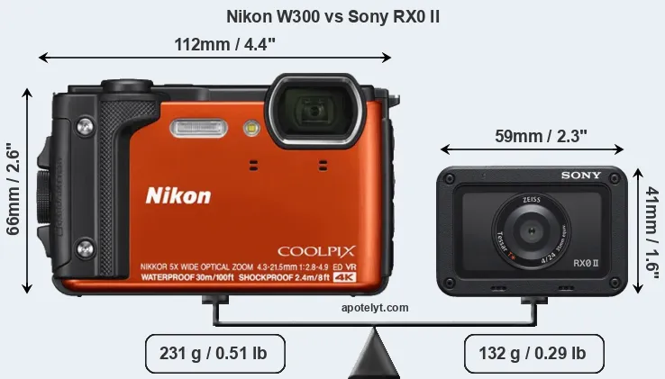 If the front view area (width x height) of the cameras is taken as an aggregate measure of their size, the Sony RX0 II is considerably smaller (67 percent) than the Nikon W300. Moreover, the RX0 II is substantially lighter (43 percent) than the W300. In this context, it is worth noting that both cameras are splash and dust-proof and can, hence, be used in inclement weather conditions or harsh environments. More than that, both cameras are water-proof and can, thus, be used for underwater photography.