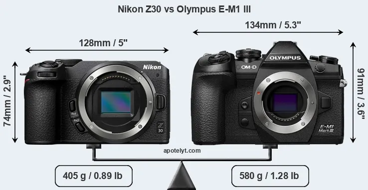 The physical size and weight of the Nikon Z30 and the Olympus E-M1 III are illustrated in the side-by-side display below. The two cameras are presented according to their relative size. Three successive views from the front, the top, and the rear are shown. All size dimensions are rounded to the nearest millimeter.
