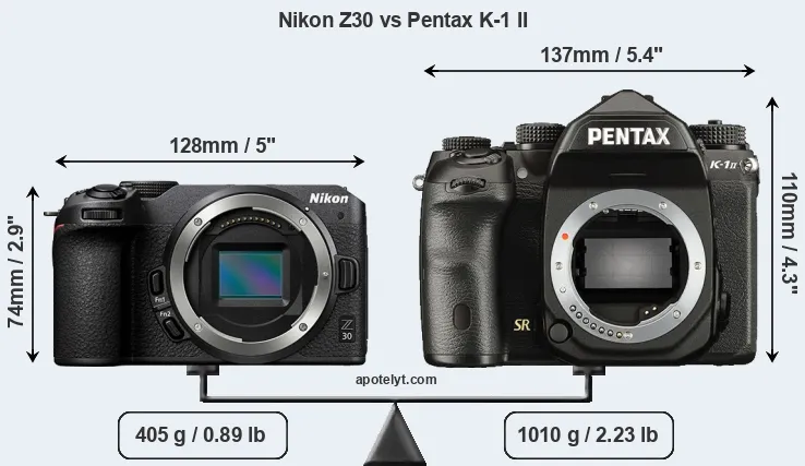 An illustration of the physical size and weight of the Nikon Z30 and the Pentax K-1 II is provided in the side-by-side display below. The two cameras are presented according to their relative size. Three successive views from the front, the top, and the rear are shown. All width, height and depth measures are rounded to the nearest millimeter.