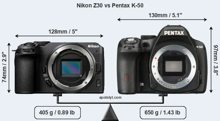 The physical size and weight of the Nikon Z30 and the Pentax K-50 are illustrated in the side-by-side display below. The two cameras are presented according to their relative size. Three consecutive views from the front, the top, and the rear side are shown. All width, height and depth measures are rounded to the nearest millimeter.