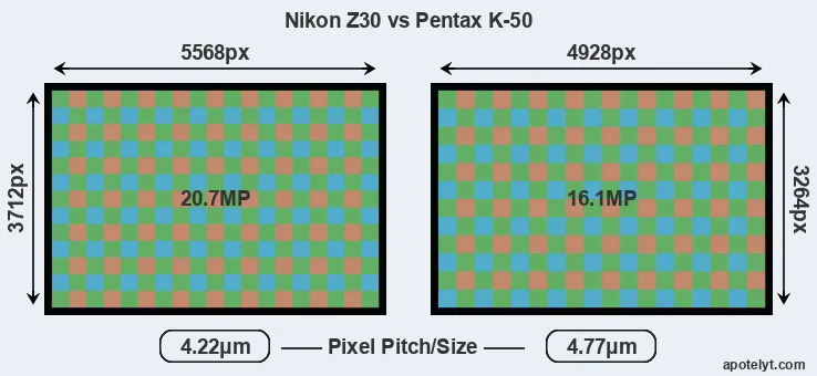 | Sensor Specs | Nikon Z30 | Pentax K-50 |