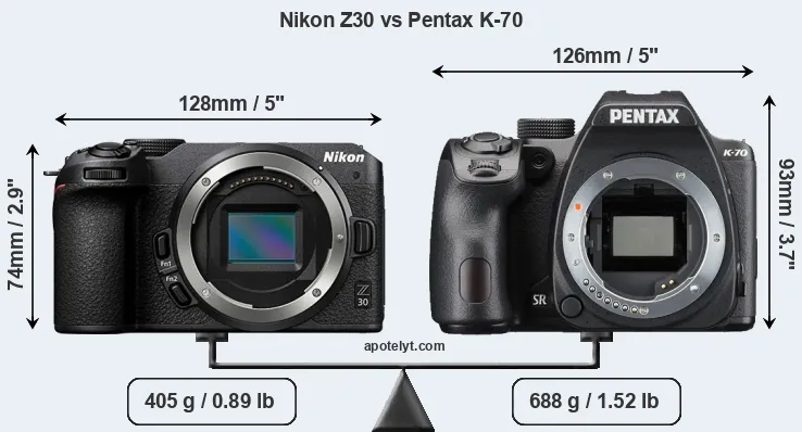 An illustration of the physical size and weight of the Nikon Z30 and the Pentax K-70 is provided in the side-by-side display below. The two cameras are presented according to their relative size. Three successive views from the front, the top, and the rear are shown. All width, height and depth measures are rounded to the nearest millimeter.