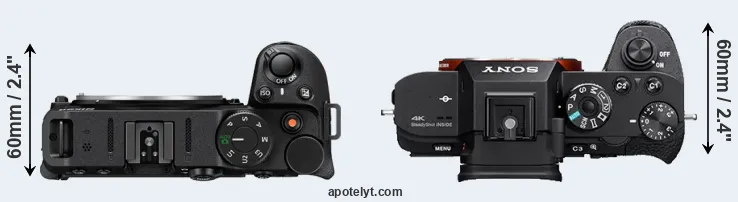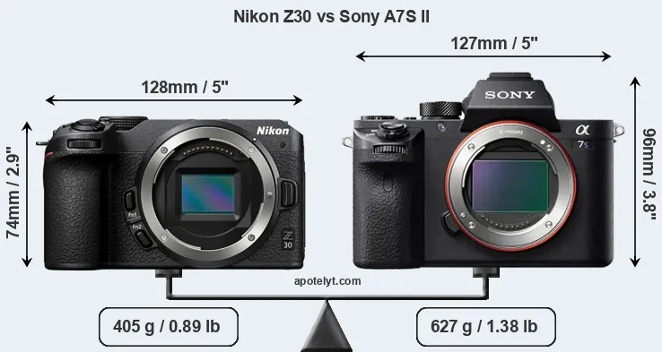 The physical size and weight of the Nikon Z30 and the Sony A7S II are illustrated in the side-by-side display below. The two cameras are presented according to their relative size. Three consecutive perspectives from the front, the top, and the back are available. All width, height and depth measures are rounded to the nearest millimeter.
