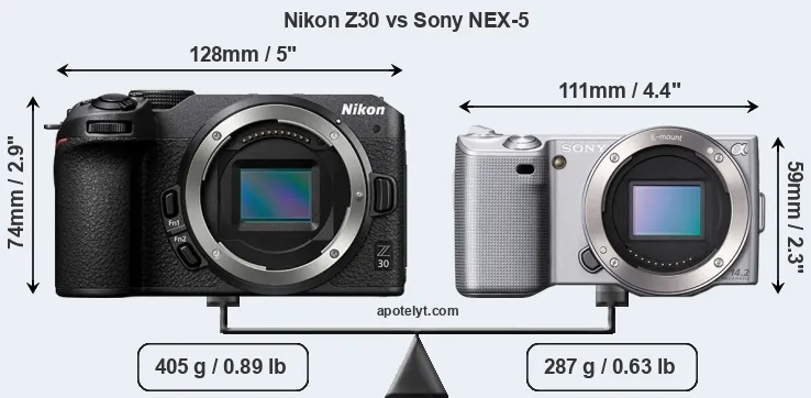 The side-by-side display below illustrates the physical size and weight of the Nikon Z30 and the Sony NEX-5. The two cameras are presented according to their relative size. Three successive views from the front, the top, and the rear are shown. All width, height and depth measures are rounded to the nearest millimeter.