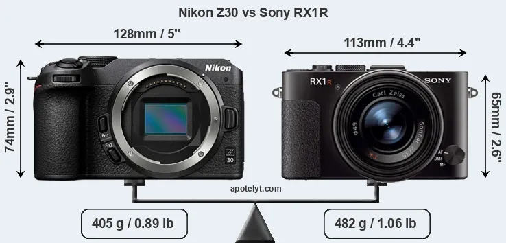 An illustration of the physical size and weight of the Nikon Z30 and the Sony RX1R is provided in the side-by-side display below. The two cameras are presented according to their relative size. Three successive views from the front, the top, and the rear are shown. All width, height and depth dimensions are rounded to the nearest millimeter.