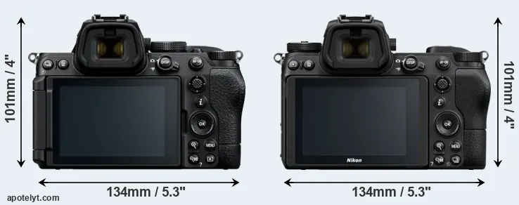 The physical size and weight of the Nikon Z5 II and the Nikon Z6 are illustrated in the side-by-side display below. The two cameras are presented according to their relative size. Three consecutive views from the front, the top, and the rear side are shown. All width, height and depth measures are rounded to the nearest millimeter.
