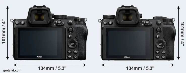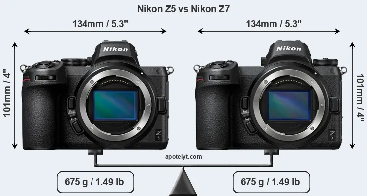 The physical size and weight of the Nikon Z5 and the Nikon Z7 are illustrated in the side-by-side display below. The two cameras are presented according to their relative size. Three consecutive perspectives from the front, the top, and the back are available. All width, height and depth measures are rounded to the nearest millimeter.