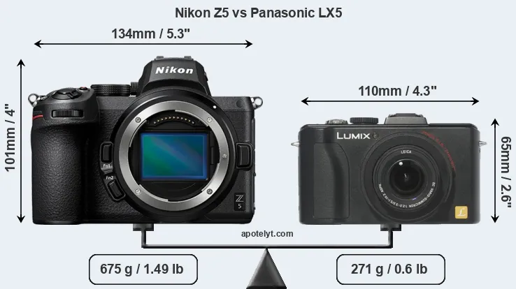 The side-by-side display below illustrates the physical size and weight of the Nikon Z5 and the Panasonic LX5. The two cameras are presented according to their relative size. Three consecutive perspectives from the front, the top, and the back are available. All size dimensions are rounded to the nearest millimeter.
