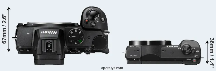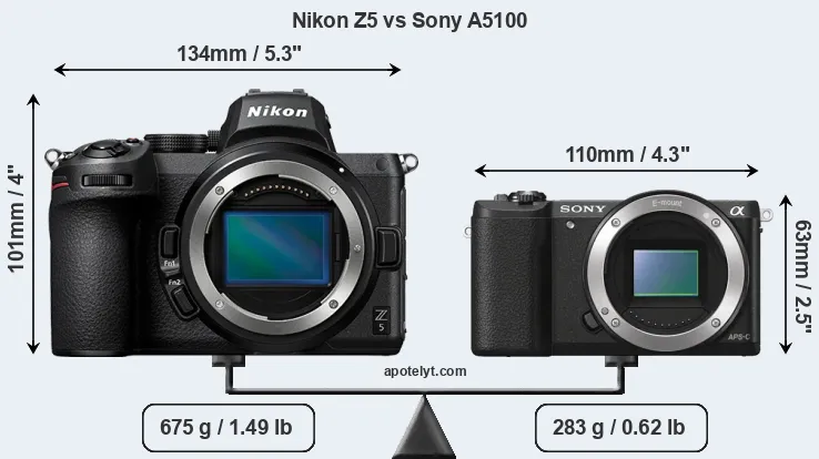 An illustration of the physical size and weight of the Nikon Z5 and the Sony A5100 is provided in the side-by-side display below. The two cameras are presented according to their relative size. Three consecutive perspectives from the front, the top, and the back are available. All width, height and depth dimensions are rounded to the nearest millimeter.