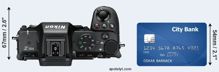 The physical dimensions of the Nikon Z50 II relative to a credit card are illustrated in the side-by-side display below. Three consecutive perspectives from the front, the top, and the back are presented. All width, height and depth measures are rounded to the nearest millimeter.