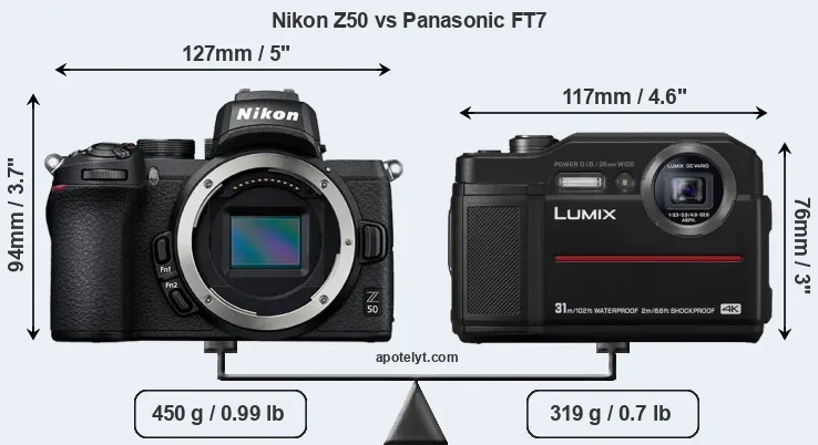 The physical size and weight of the Nikon Z50 and the Panasonic FT7 are illustrated in the side-by-side display below. The two cameras are presented according to their relative size. Three consecutive perspectives from the front, the top, and the back are available. All width, height and depth measures are rounded to the nearest millimeter.