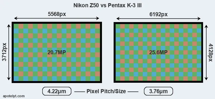 | Sensor Specs | Nikon Z50 | Pentax K-3 III |