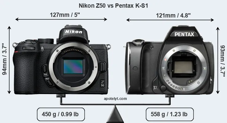 The side-by-side display below illustrates the physical size and weight of the Nikon Z50 and the Pentax K-S1. The two cameras are presented according to their relative size. Three consecutive perspectives from the front, the top, and the back are available. All width, height and depth dimensions are rounded to the nearest millimeter.