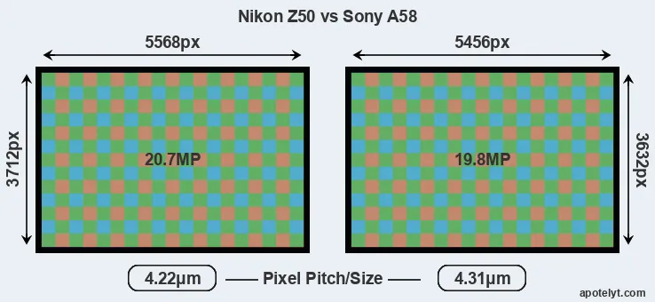 | Sensor Specs | Nikon Z50 | Sony A58 |