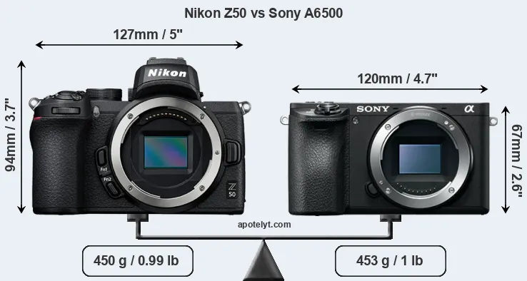 The physical size and weight of the Nikon Z50 and the Sony A6500 are illustrated in the side-by-side display below. The two cameras are presented according to their relative size. Three consecutive perspectives from the front, the top, and the back are available. All width, height and depth dimensions are rounded to the nearest millimeter.