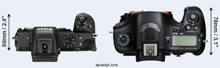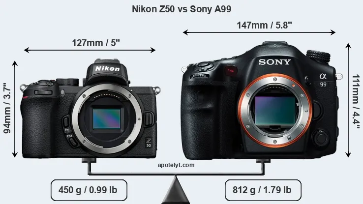 The physical size and weight of the Nikon Z50 and the Sony A99 are illustrated in the side-by-side display below. The two cameras are presented according to their relative size. Three consecutive views from the front, the top, and the rear side are shown. All size dimensions are rounded to the nearest millimeter.