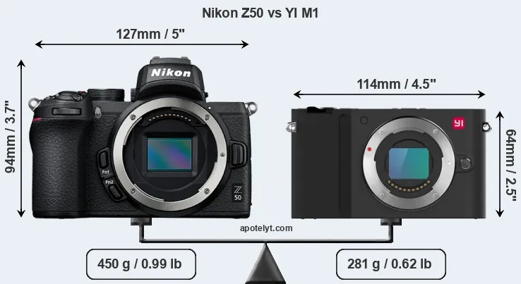 The physical size and weight of the Nikon Z50 and the YI M1 are illustrated in the side-by-side display below. The two cameras are presented according to their relative size. Three consecutive perspectives from the front, the top, and the back are available. All width, height and depth dimensions are rounded to the nearest millimeter.