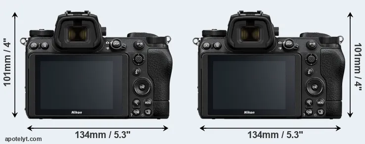 An illustration of the physical size and weight of the Nikon Z6 II and the Nikon Z7 II is provided in the side-by-side display below. The two cameras are presented according to their relative size. Three consecutive perspectives from the front, the top, and the back are available. All width, height and depth dimensions are rounded to the nearest millimeter.