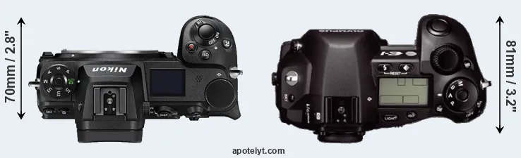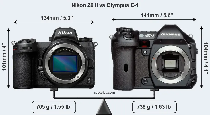 The physical size and weight of the Nikon Z6 II and the Olympus E-1 are illustrated in the side-by-side display below. The two cameras are presented according to their relative size. Three successive views from the front, the top, and the rear are shown. All width, height and depth dimensions are rounded to the nearest millimeter.