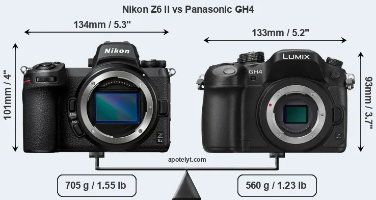 The side-by-side display below illustrates the physical size and weight of the Nikon Z6 II and the Panasonic GH4. The two cameras are presented according to their relative size. Three successive views from the front, the top, and the rear are shown. All width, height and depth measures are rounded to the nearest millimeter.