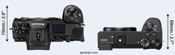 An illustration of the physical size and weight of the Nikon Z6 II and the Sony A6600 is provided in the side-by-side display below. The two cameras are presented according to their relative size. Three consecutive views from the front, the top, and the rear side are shown. All width, height and depth measures are rounded to the nearest millimeter.