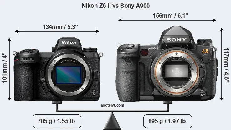 The physical size and weight of the Nikon Z6 II and the Sony A900 are illustrated in the side-by-side display below. The two cameras are presented according to their relative size. Three consecutive perspectives from the front, the top, and the back are available. All size dimensions are rounded to the nearest millimeter.