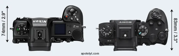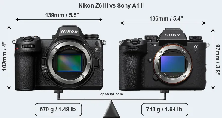 The side-by-side display below illustrates the physical size and weight of the Nikon Z6 III and the Sony A1 II. The two cameras are presented according to their relative size. Three successive views from the front, the top, and the rear are shown. All width, height and depth dimensions are rounded to the nearest millimeter.
