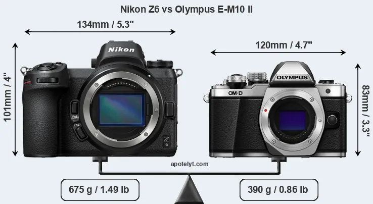 An illustration of the physical size and weight of the Nikon Z6 and the Olympus E-M10 II is provided in the side-by-side display below. The two cameras are presented according to their relative size. Three consecutive perspectives from the front, the top, and the back are available. All size dimensions are rounded to the nearest millimeter.