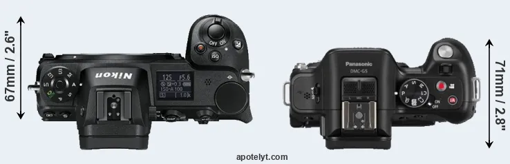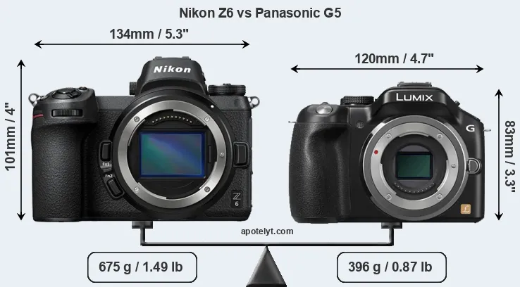 An illustration of the physical size and weight of the Nikon Z6 and the Panasonic G5 is provided in the side-by-side display below. The two cameras are presented according to their relative size. Three consecutive perspectives from the front, the top, and the back are available. All size dimensions are rounded to the nearest millimeter.