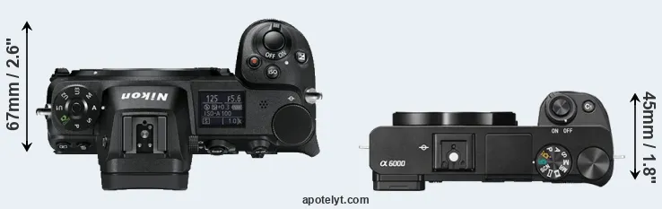 The side-by-side display below illustrates the physical size and weight of the Nikon Z6 and the Sony A6000. The two cameras are presented according to their relative size. Three successive views from the front, the top, and the rear are shown. All size dimensions are rounded to the nearest millimeter.