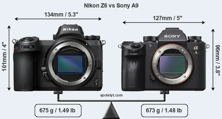 An illustration of the physical size and weight of the Nikon Z6 and the Sony A9 is provided in the side-by-side display below. The two cameras are presented according to their relative size. Three consecutive perspectives from the front, the top, and the back are available. All width, height and depth measures are rounded to the nearest millimeter.