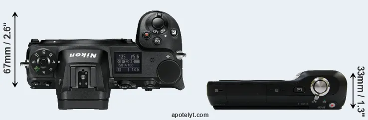 The physical size and weight of the Nikon Z6 and the Sony NEX-3 are illustrated in the side-by-side display below. The two cameras are presented according to their relative size. Three consecutive perspectives from the front, the top, and the back are available. All width, height and depth dimensions are rounded to the nearest millimeter.