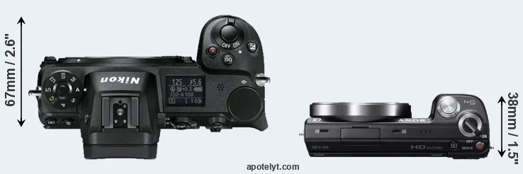 An illustration of the physical size and weight of the Nikon Z6 and the Sony NEX-5N is provided in the side-by-side display below. The two cameras are presented according to their relative size. Three consecutive views from the front, the top, and the rear side are shown. All width, height and depth measures are rounded to the nearest millimeter.