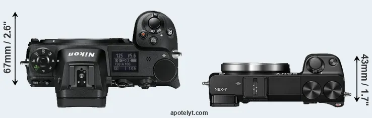 The side-by-side display below illustrates the physical size and weight of the Nikon Z6 and the Sony NEX-7. The two cameras are presented according to their relative size. Three successive views from the front, the top, and the rear are shown. All size dimensions are rounded to the nearest millimeter.