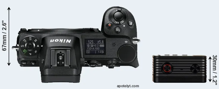 The side-by-side display below illustrates the physical size and weight of the Nikon Z6 and the Sony RX0. The two cameras are presented according to their relative size. Three successive views from the front, the top, and the rear are shown. All size dimensions are rounded to the nearest millimeter.