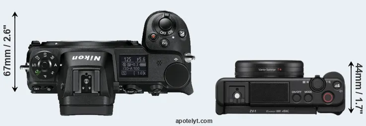 The physical size and weight of the Nikon Z6 and the Sony ZV-1 are illustrated in the side-by-side display below. The two cameras are presented according to their relative size. Three consecutive views from the front, the top, and the rear side are shown. All size dimensions are rounded to the nearest millimeter.
