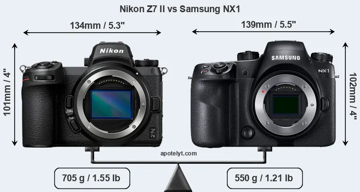 An illustration of the physical size and weight of the Nikon Z7 II and the Samsung NX1 is provided in the side-by-side display below. The two cameras are presented according to their relative size. Three successive views from the front, the top, and the rear are shown. All width, height and depth dimensions are rounded to the nearest millimeter.
