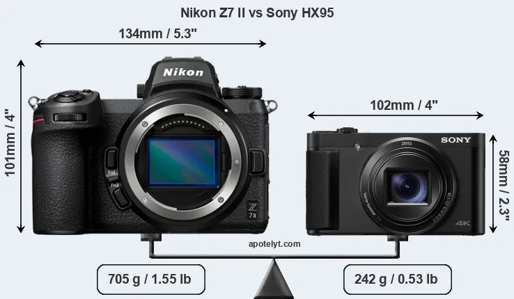 An illustration of the physical size and weight of the Nikon Z7 II and the Sony HX95 is provided in the side-by-side display below. The two cameras are presented according to their relative size. Three successive views from the front, the top, and the rear are shown. All width, height and depth measures are rounded to the nearest millimeter.