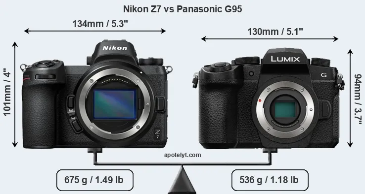 An illustration of the physical size and weight of the Nikon Z7 and the Panasonic G95 is provided in the side-by-side display below. The two cameras are presented according to their relative size. Three consecutive views from the front, the top, and the rear side are shown. All width, height and depth measures are rounded to the nearest millimeter.