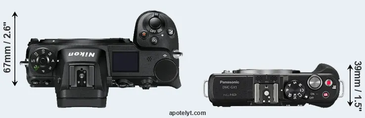 An illustration of the physical size and weight of the Nikon Z7 and the Panasonic GX1 is provided in the side-by-side display below. The two cameras are presented according to their relative size. Three successive views from the front, the top, and the rear are shown. All width, height and depth measures are rounded to the nearest millimeter.