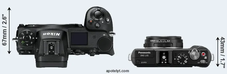 The physical size and weight of the Nikon Z7 and the Panasonic LX5 are illustrated in the side-by-side display below. The two cameras are presented according to their relative size. Three consecutive views from the front, the top, and the rear side are shown. All size dimensions are rounded to the nearest millimeter.