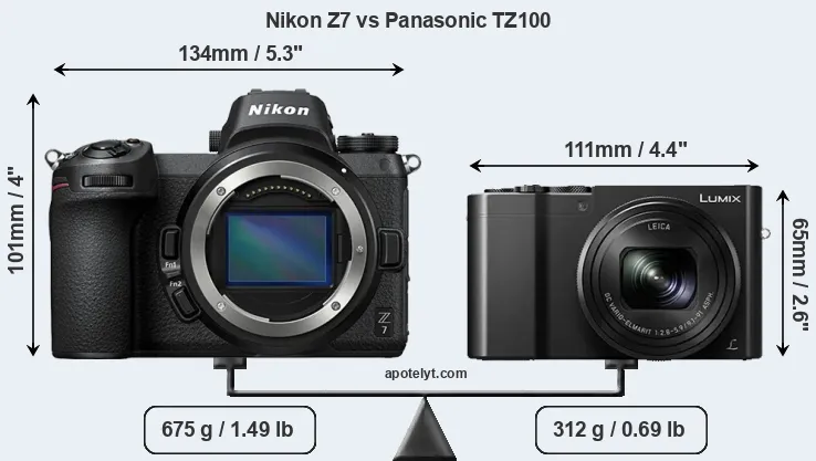 An illustration of the physical size and weight of the Nikon Z7 and the Panasonic TZ100 is provided in the side-by-side display below. The two cameras are presented according to their relative size. Three successive views from the front, the top, and the rear are shown. All width, height and depth dimensions are rounded to the nearest millimeter.