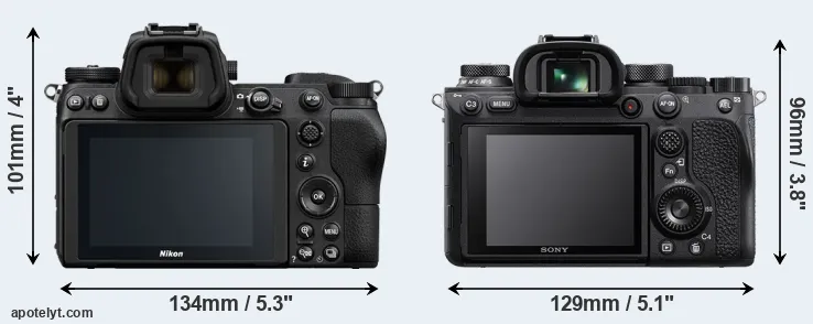 The side-by-side display below illustrates the physical size and weight of the Nikon Z7 and the Sony A9 II. The two cameras are presented according to their relative size. Three consecutive perspectives from the front, the top, and the back are available. All width, height and depth measures are rounded to the nearest millimeter.