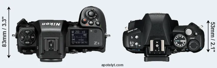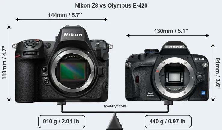 The physical size and weight of the Nikon Z8 and the Olympus E-420 are illustrated in the side-by-side display below. The two cameras are presented according to their relative size. Three consecutive perspectives from the front, the top, and the back are available. All width, height and depth dimensions are rounded to the nearest millimeter.