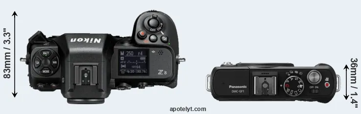 The side-by-side display below illustrates the physical size and weight of the Nikon Z8 and the Panasonic GF1. The two cameras are presented according to their relative size. Three consecutive perspectives from the front, the top, and the back are available. All width, height and depth measures are rounded to the nearest millimeter.