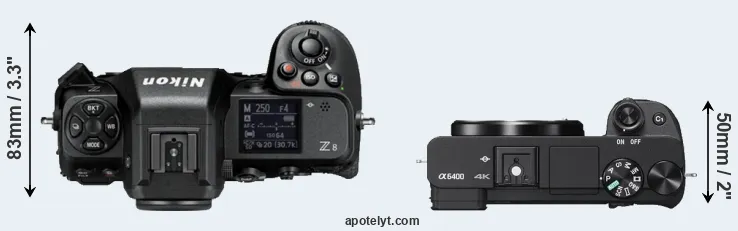 The side-by-side display below illustrates the physical size and weight of the Nikon Z8 and the Sony A6400. The two cameras are presented according to their relative size. Three successive views from the front, the top, and the rear are shown. All size dimensions are rounded to the nearest millimeter.