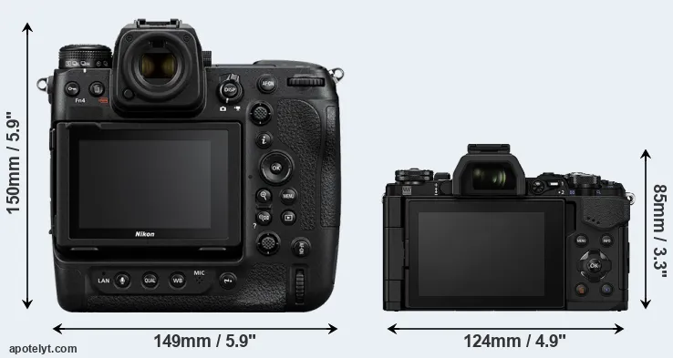 The physical size and weight of the Nikon Z9 and the Olympus E-M5 II are illustrated in the side-by-side display below. The two cameras are presented according to their relative size. Three consecutive perspectives from the front, the top, and the back are available. All size dimensions are rounded to the nearest millimeter.