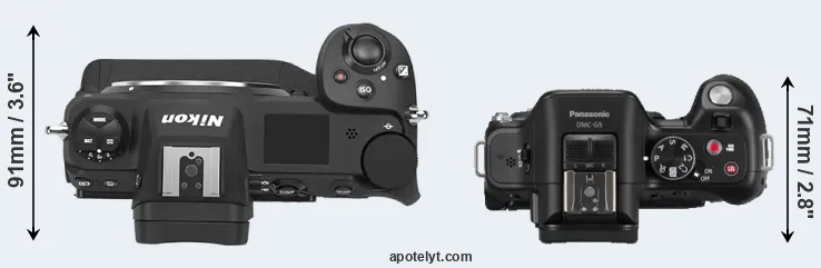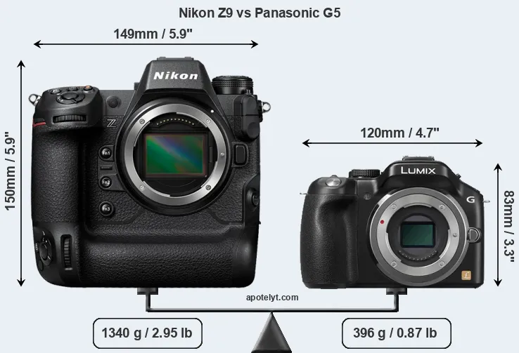 The side-by-side display below illustrates the physical size and weight of the Nikon Z9 and the Panasonic G5. The two cameras are presented according to their relative size. Three consecutive perspectives from the front, the top, and the back are available. All width, height and depth measures are rounded to the nearest millimeter.