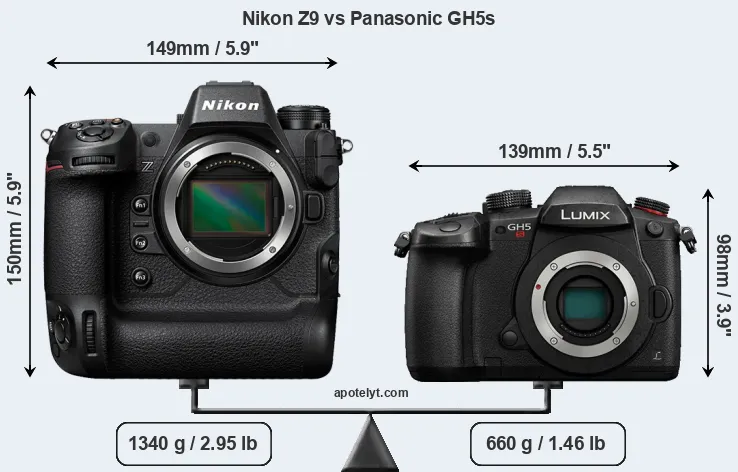 An illustration of the physical size and weight of the Nikon Z9 and the Panasonic GH5s is provided in the side-by-side display below. The two cameras are presented according to their relative size. Three consecutive perspectives from the front, the top, and the back are available. All width, height and depth measures are rounded to the nearest millimeter.